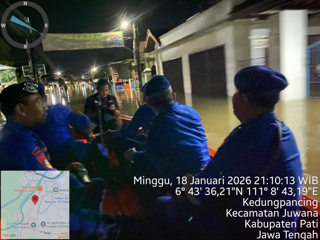 Pati Indept Jateng.My.Id Satuan Polisi Air dan Udara (Satpolairud) Polresta Pati melaksanakan patroli malam sekaligus memberikan imbauan kamtibmas di sejumlah wilayah terdampak banjir di Kecamatan Juwana, Kabupaten Pati, Minggu (18/1/2026) malam. Kegiatan dimulai sekitar pukul 20.30 WIB dengan menyasar desa-desa yang mengalami genangan cukup tinggi. Kapolresta Pati melalui Kasat Polairud Polresta Pati, Kompol Hendrik Irawan, […]