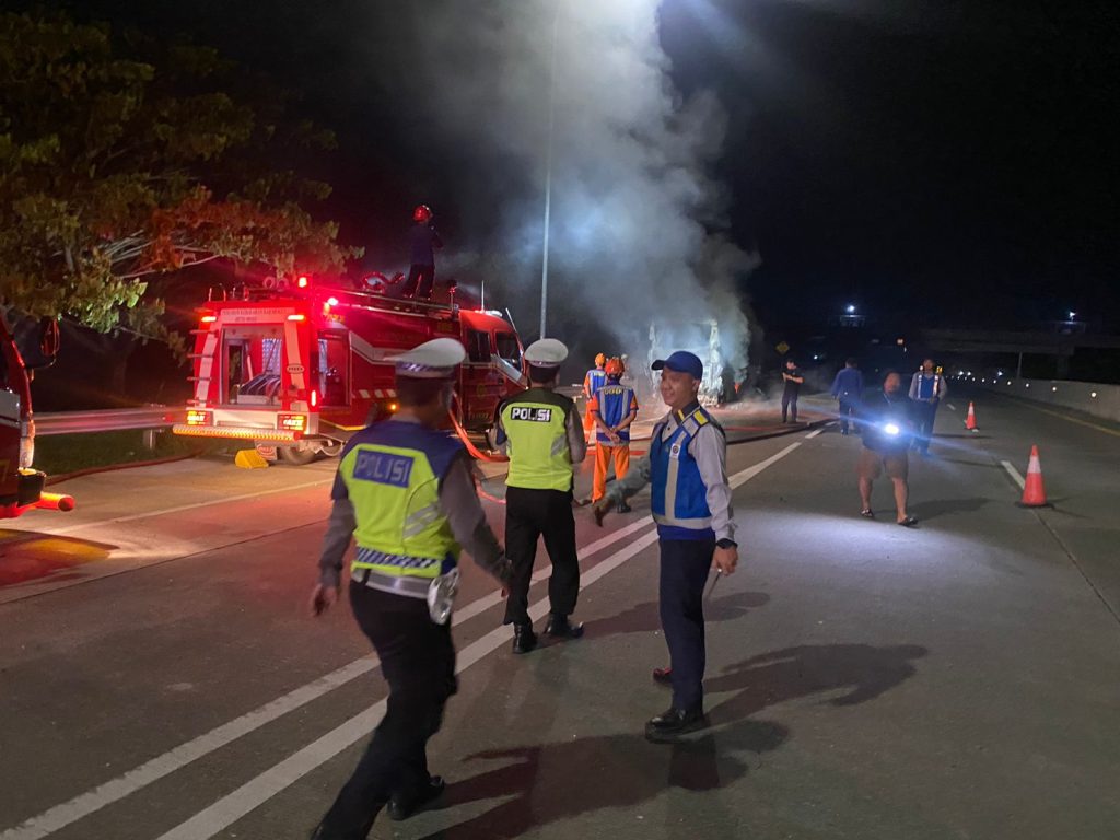 Gerak Cepat Unit Lantas Polsek Sambungmacan Selamatkan Penumpang, Bus Rosalia Indah Terbakar di Tol KM 544 Sragen