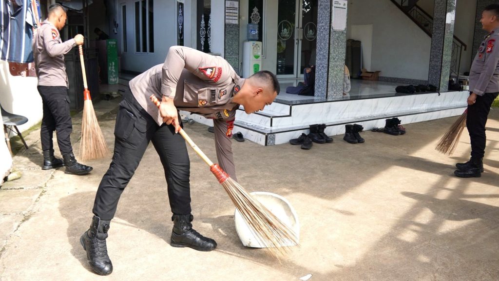 Jaga Kebersihan Rumah Ibadah, Brimob PMJ Korvey Lingkungan Masjid Al Mubarokah