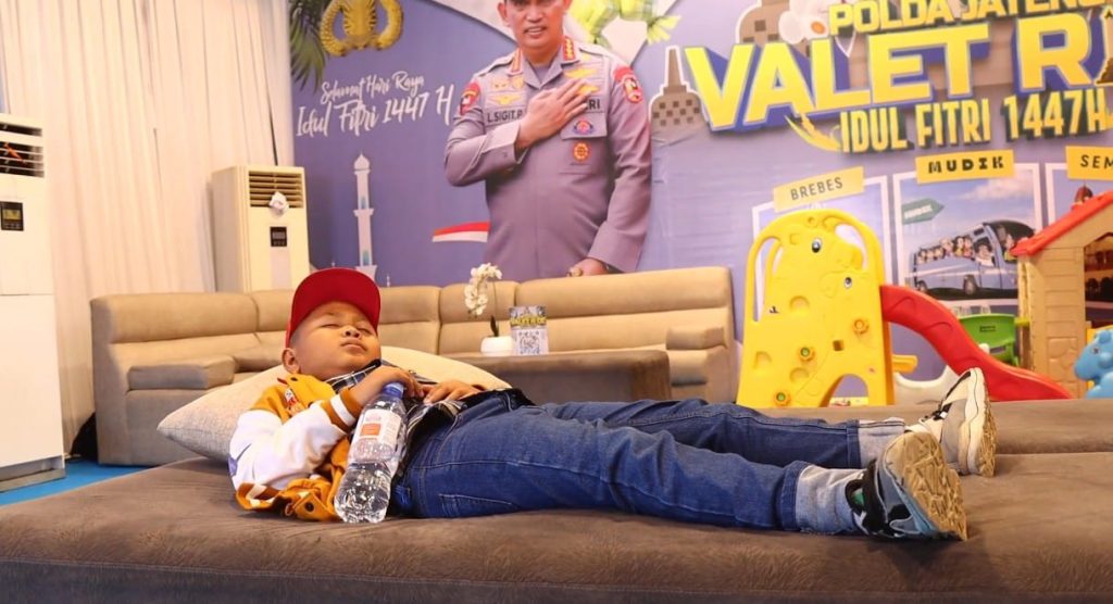 Brebes – Polda Jateng Indept Jateng.My.Id | Suasana hangat dan penuh cerita mewarnai Pos Pelayanan Valet Ride Polda Jawa Tengah di Brebes pada Senin (16/3/2026). Seorang bocah pemudik yang hendak pulang kampung ke Sragen bersama kedua orang tuanya tampak tertidur nyenyak di ruang tunggu saat menanti jadwal keberangkatan bus. Bocah berusia 8 tahun tersebut merupakan […]