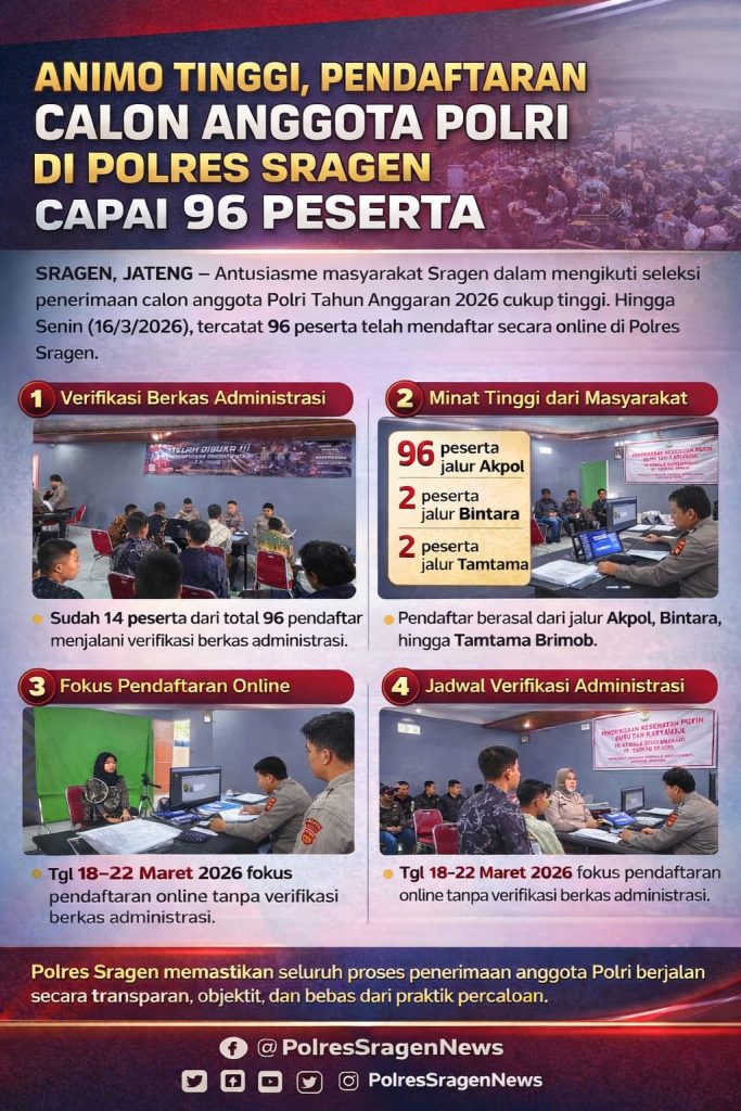 SRAGEN, JATENG Indept Jateng.My.Id – Antusiasme masyarakat Kabupaten Sragen untuk mengabdikan diri sebagai anggota Polri pada penerimaan Tahun Anggaran 2026 menunjukkan tren yang cukup tinggi. Hingga Senin (16/3/2026), Panitia Bantuan Penerimaan (Panbanrim) Polres Sragen mencatat sebanyak 96 peserta telah melakukan pendaftaran secara online pada berbagai jalur seleksi. Dari jumlah tersebut, 14 peserta telah menjalani proses […]