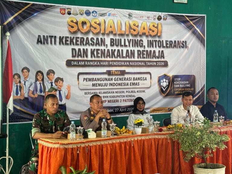 KENDAL Indept Jateng.My.Id — Satuan Pembinaan Masyarakat (Sat Binmas) Polres Kendal menggelar sosialisasi anti kekerasan, bullying, intoleransi, dan kenakalan remaja di SMPN 2 Patebon, Kabupaten Kendal, Senin (27/4/2026) pukul 09.30 WIB. Kegiatan ini menghadirkan sejumlah unsur pemerintah daerah dan diikuti pelajar serta guru dari beberapa sekolah.