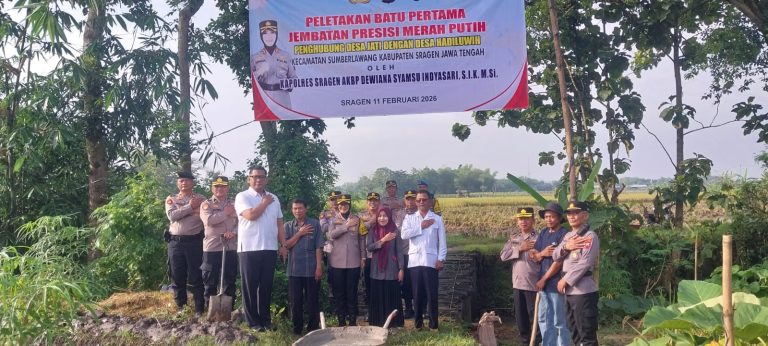 Kapolres Sragen AKBP Dewiana Syamsu Indyasari secara langsung melaksanakan peletakan batu pertama pembangunan Jembatan Presisi Merah Putih yang menghubungkan Desa Jati dan Desa Hadiluwih, Kecamatan Sumberlawang, Rabu (11/2/2026) pagi.