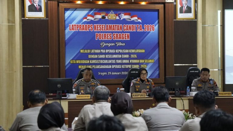 SRAGEN Indept Jateng.My.Id — Kapolres Sragen AKBP Dewiana Syamsu Indiasari memimpin langsung kegiatan Pelatihan Pra Operasi (Lat Pra Ops) Keselamatan Candi 2026 yang digelar di Aula Satya Haprabu Mapolres Sragen, sebagai langkah awal memastikan kesiapan personel dalam pelaksanaan operasi kepolisian yang mengedepankan keselamatan dan ketertiban masyarakat.