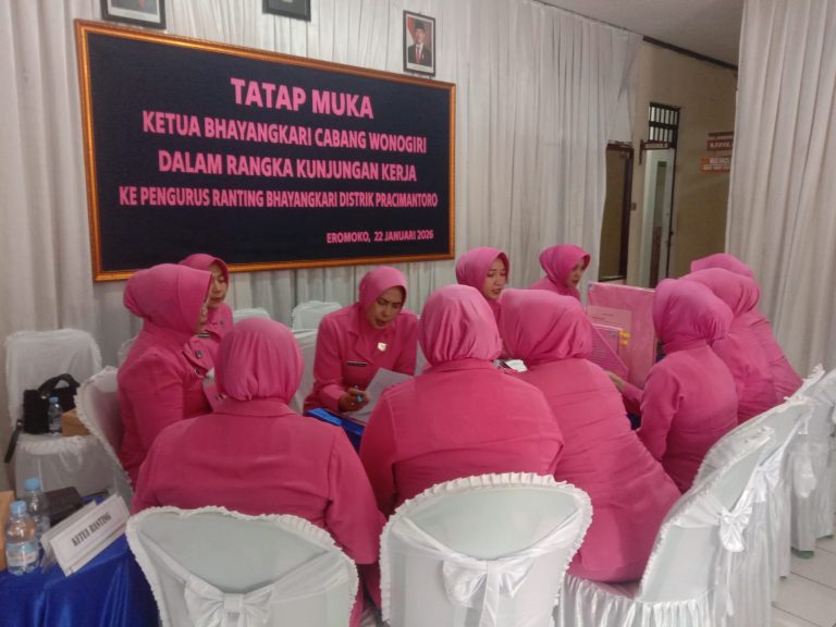 Wonogiri Indept Jateng.My.Id – Ketua Bhayangkari Cabang Wonogiri, Ibu Karlina Wahyu, melaksanakan kunjungan kerja ke Distrik Pracimantoro yang dipusatkan di Mako Polsek Eromoko, Kamis (22/1/2026). Kegiatan yang diikuti sekitar 40 orang tersebut berlangsung tertib dan lancar sebagai bagian dari agenda pembinaan organisasi Bhayangkari di tingkat distrik.