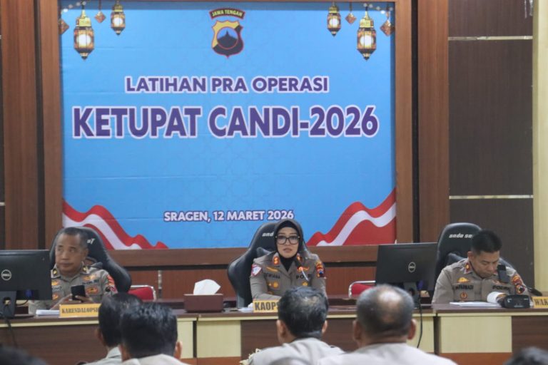 Sragen, Jateng Indept jateng.My.Id – Polres Sragen menggelar Latihan Pra Operasi (Lat Pra Ops) Ketupat Candi 2026 sebagai langkah mematangkan kesiapan pengamanan arus mudik dan balik Hari Raya Idul Fitri 1447 H. Kegiatan yang dilaksanakan di Aula Satya Haprabu Mapolres Sragen tersebut diikuti para pejabat utama serta personel yang akan terlibat dalam operasi pengamanan Lebaran tahun 2026.