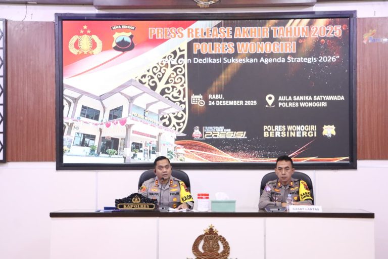 Wonogiri Indept Jateng my id- Polres Wonogiri menggelar Press Release Akhir Tahun 2025 di Gedung Mapolres Wonogiri, Rabu (24/12/2025), sebagai bentuk transparansi dan akuntabilitas kinerja kepolisian kepada publik. Kegiatan tersebut memaparkan capaian Polres Wonogiri di bidang pemeliharaan keamanan dan ketertiban masyarakat (kamtibmas), penegakan hukum, keselamatan lalu lintas, serta pelayanan publik sepanjang tahun 2025.